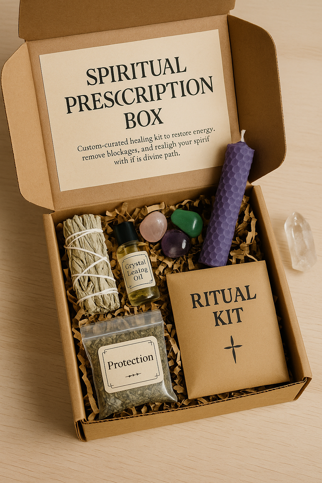 Spiritual Prescription Boxes are custom-curated healing kits designed to restore your energy, remove blockages, and realign your spirit with its divine path. Each box is intuitively crafted based on your current energy and unique situation—combining herbs, oils, crystals, candles, and ritual tools to target specific areas such as love, money, protection, cleansing, or emotional healing. These aren’t one-size-fits-all boxes—they’re energetic prescriptions from spirit, created to help you detox negativity, attract blessings, and rebalance your aura so you can move forward in power and peace.