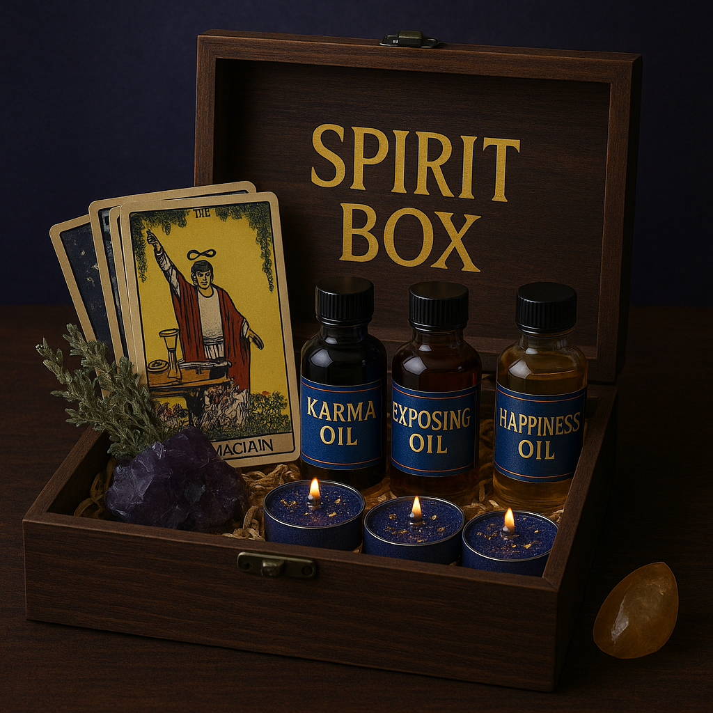 Custom Spirit Boxes are made-to-order spiritual kits personally crafted to align with your exact intention or energetic need. Whether you’re calling in love, protection, money, justice, peace, or spiritual strength, each box is intuitively designed using herbs, oils, crystals, candles, and ritual tools chosen specifically for your purpose. You can request a theme or simply tell me what’s going on in your life—and I’ll handcraft a Spirit Box that speaks directly to your energy, guided by spirit to bring balance, manifestation, and divine intervention right to your doorstep.